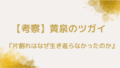 考察 【考察】『黄泉のツガイ』400年前なぜ”封”を持つ片割れは生き返らなかったのか? 黄泉のツガイに登場する伝説とされる力、”解”と”封”。その二つの力はそれぞれ朝と夜を分かつ時に生まれた運命の双子に授けられる。そして、運命の双子は一度死んで初めてその力を手に入れる。運命の双子として生を受けたアサとユル。アサは一度殺され”解... 2025.09.01 考察黄泉のツガイ